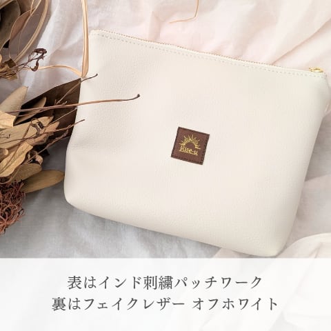 【オフホワイト】 納期:ご注文から1週間前後 ファスナー20cm×マチ4cm×高さ14cm 表:インド刺繍リボンパッチワーク 裏:フェイクレザー 内側:リバティ(アレキサンダーマーブル ピンク) ※中がカラだと自立はしません